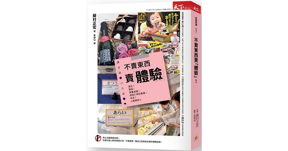《不賣東西賣「體驗」!》這本書,就是主張商品的行銷不能只從商品本身的功能考量,更要從販賣體驗的角度思考。現在的消費者常常不會缺乏什麼商品,加上每天接收的資訊量又多又雜,想要在眾多競爭者中勝出的話,商品被賦予的意義、引發消費者的想像空間、消費過程中的連結和感受等等才是關鍵點。