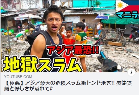我發現日本有出一派的旅遊youtuber,特色是專門跑一些經濟發展特別落後,治安形象比較差的地區,標題也都會下得很聳動。像是「永闖亞洲最貧困的地區」、「冒著生命危險進入地獄治安惡地」等等,影片的內容也都著重於突顯該地低下的物質條件以及便宜的物價。